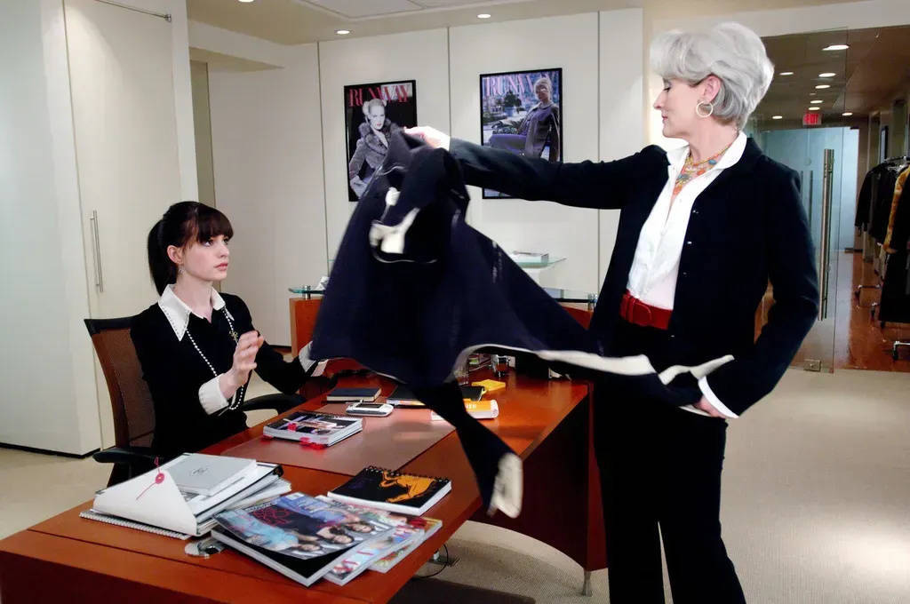 梅利尔·斯特里普饰演的时尚杂志主编米兰达,一头标志性的银发、恰到好处的配饰,简直是顶级“高智感”穿搭的教科书。